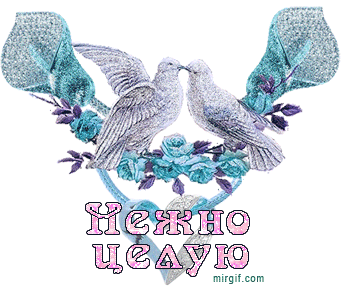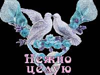 Лирическая анимационная картинка в голубых тонах с целующимися голубками и романтической надписью: «Нежно целую!».